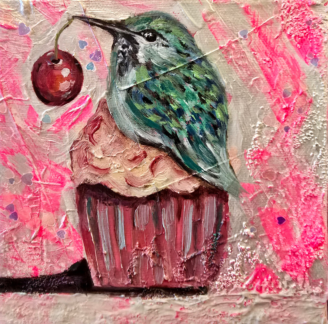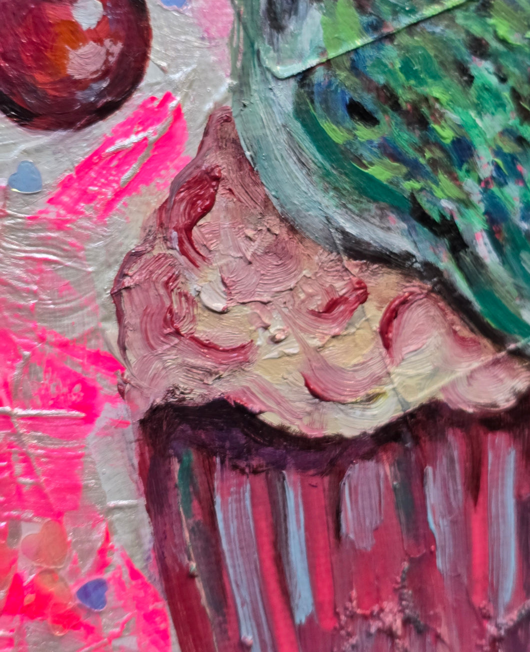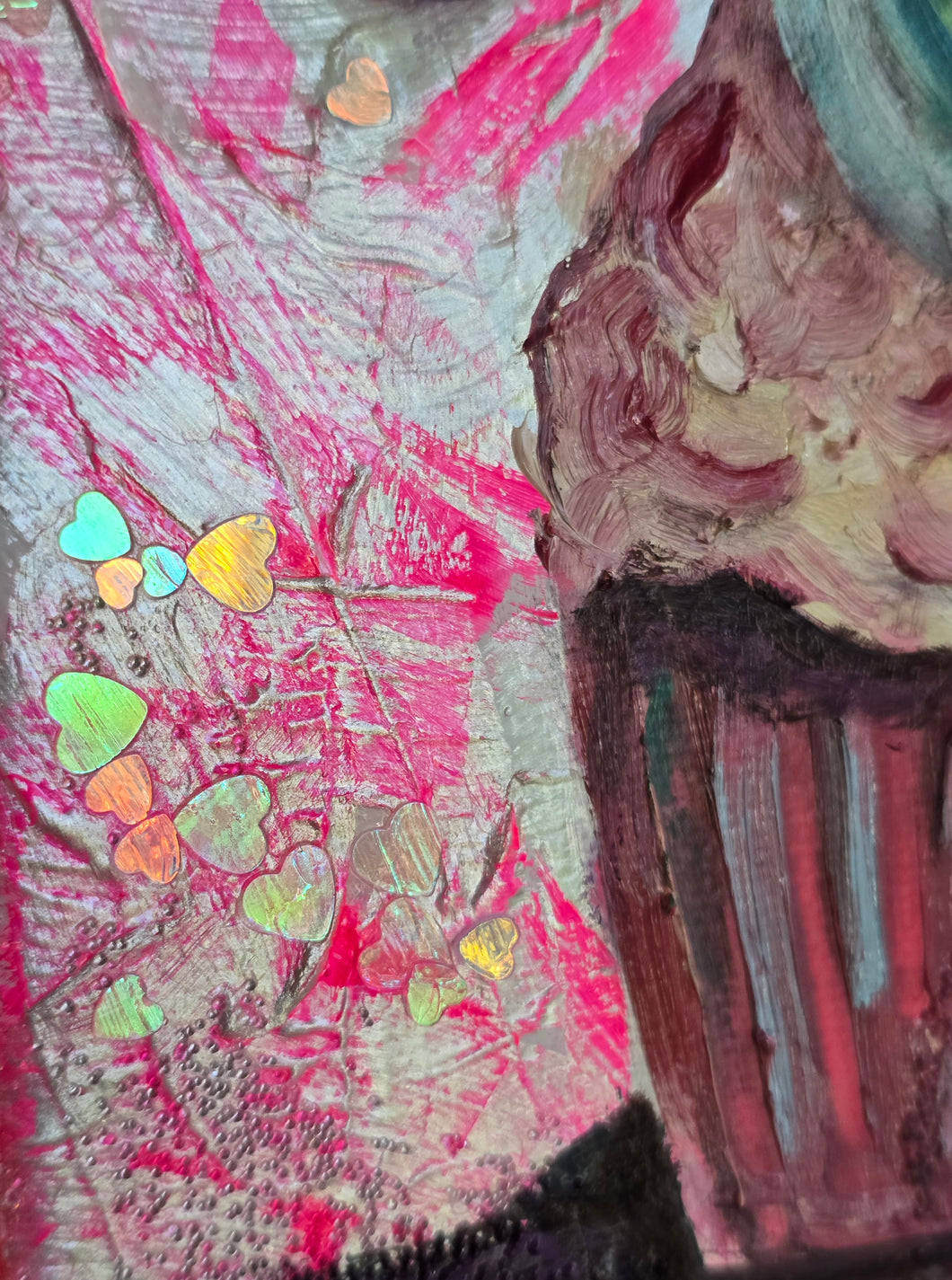 "Cherry Pop" is a burst of sweetness and vibrant energy painted with thick textured oil paint. Subtle shimmering hearts catch the light across the canvas. This miniature is a bold statement piece, ideal for injecting pure joy and color into any space.