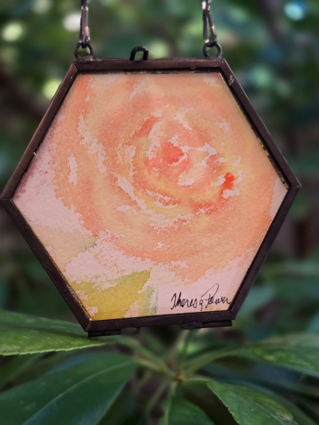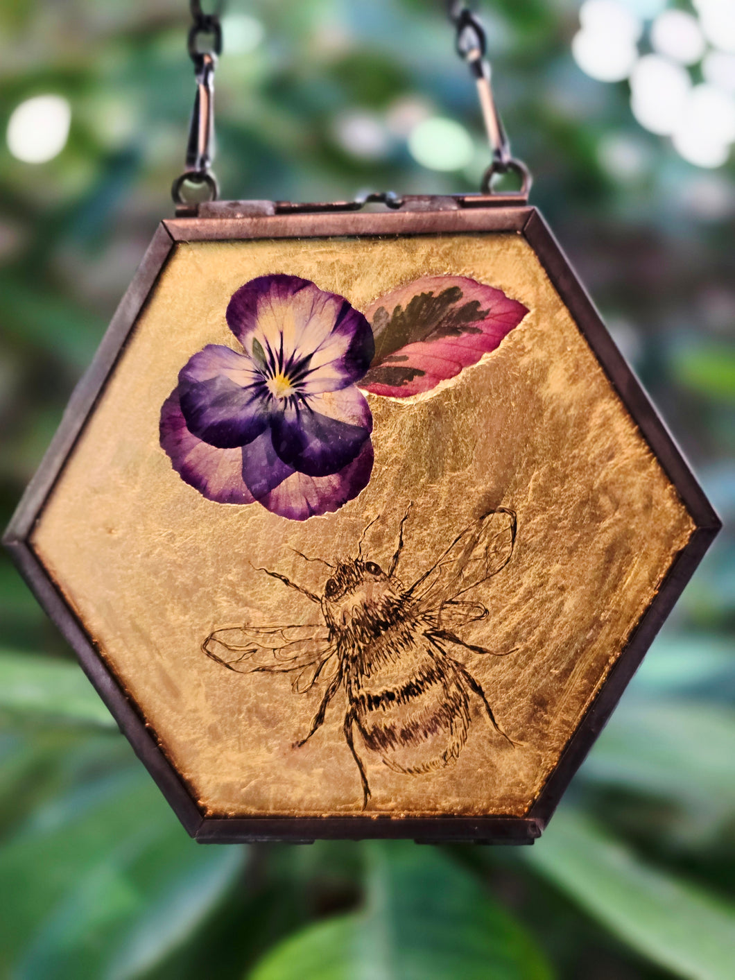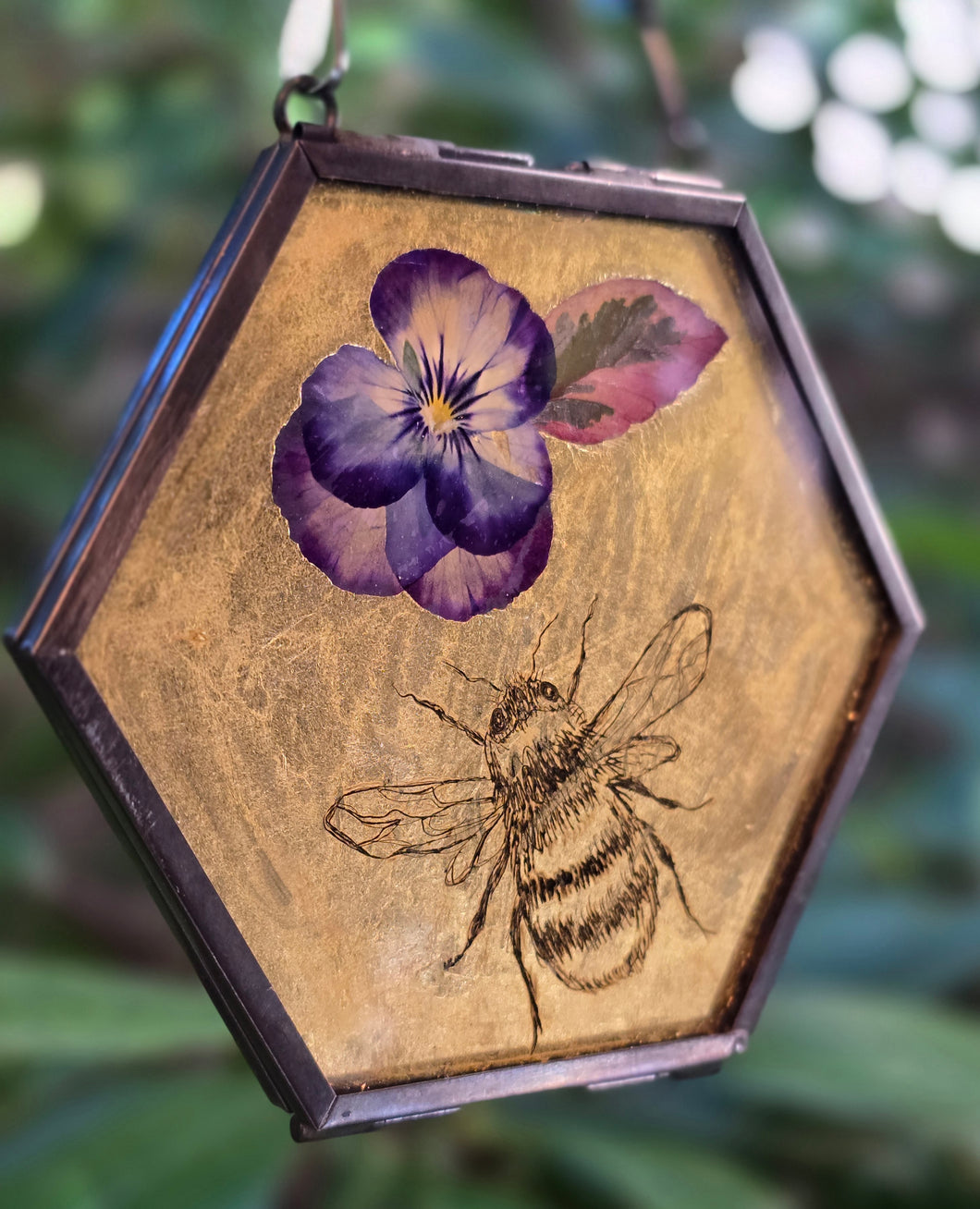Little bee etching on guilded 24k gold with watercolor roses on reverse side.