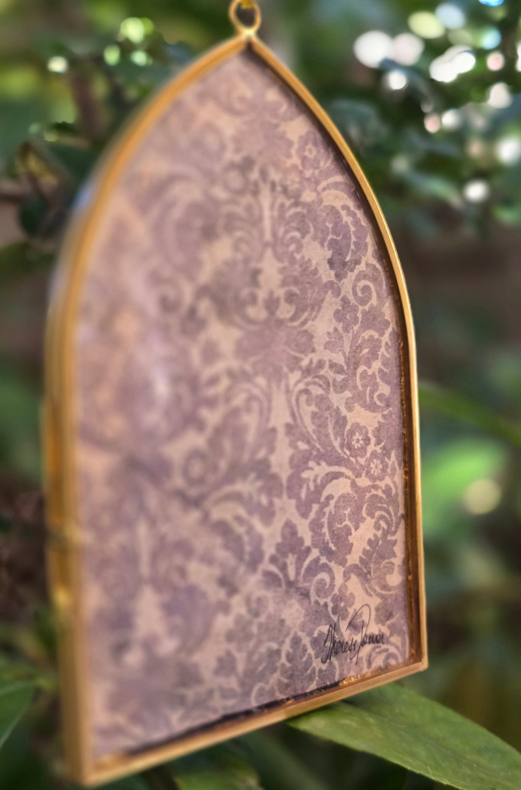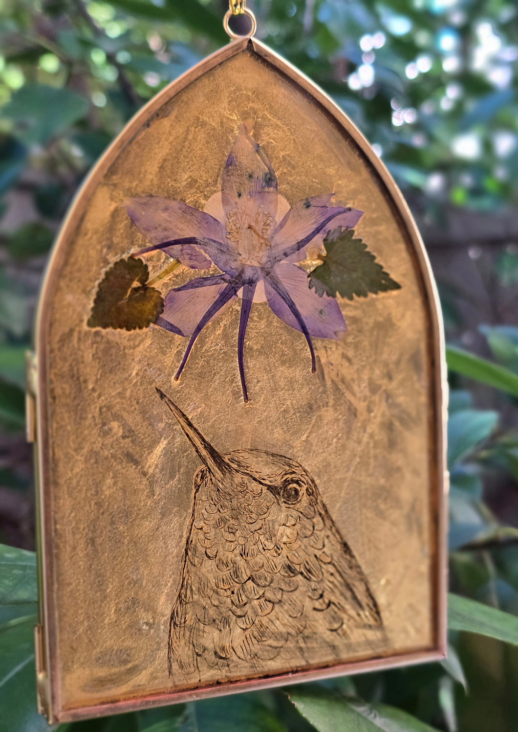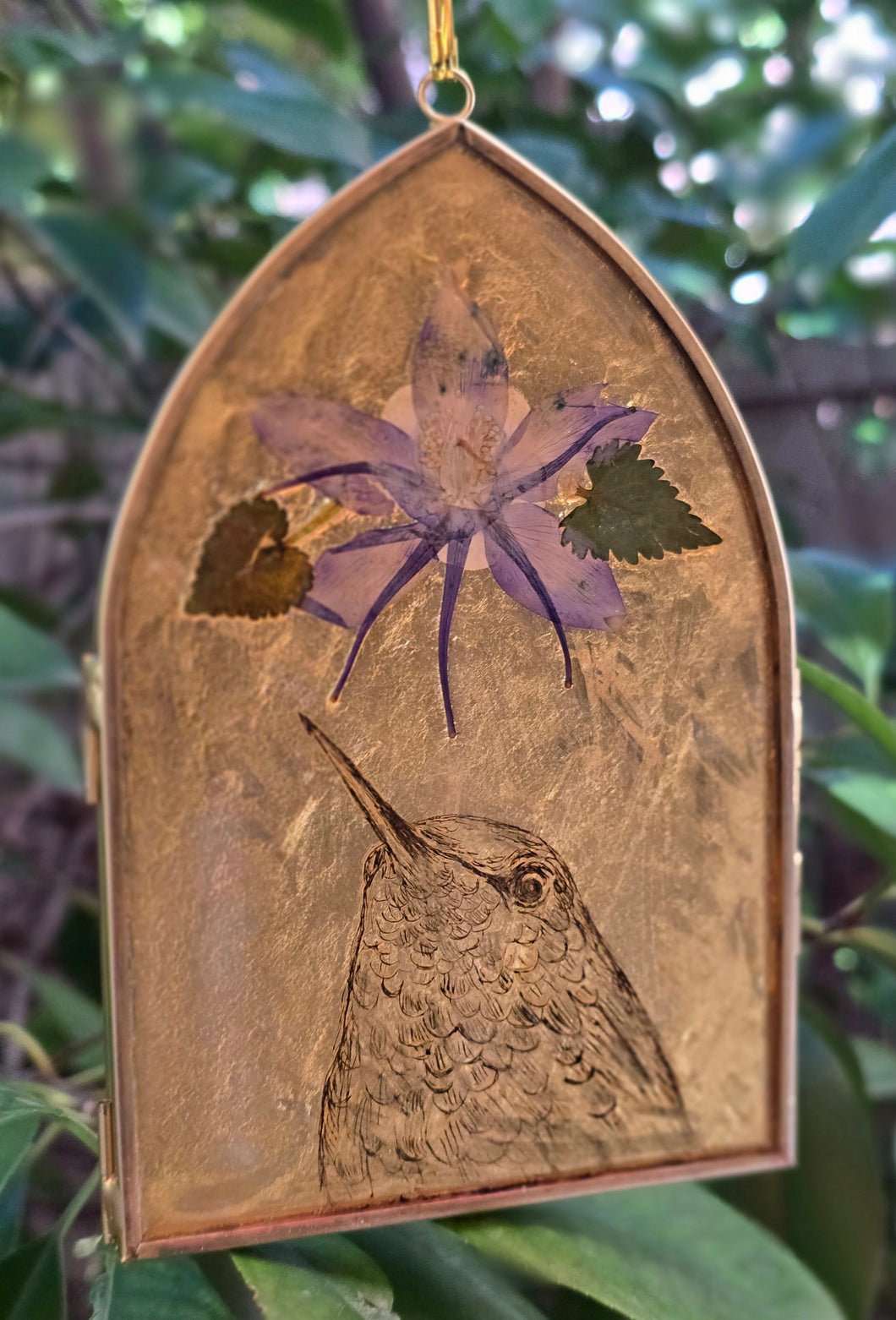 Hummingbird etching on guilded 24k gold with pressed orchid and little leaves. Decorative paper on reverse side.