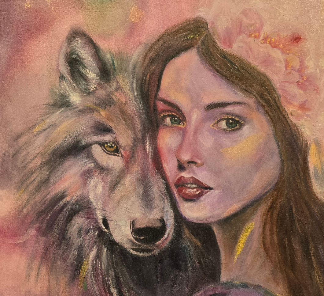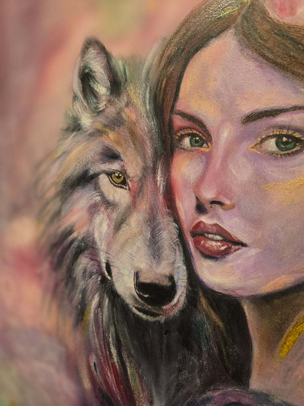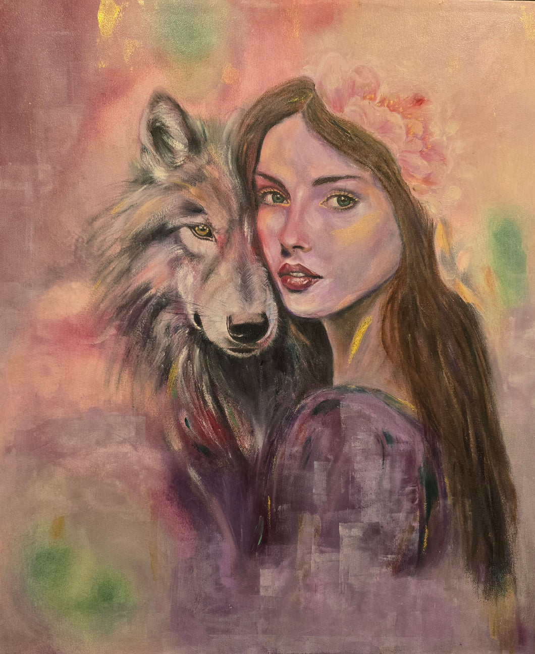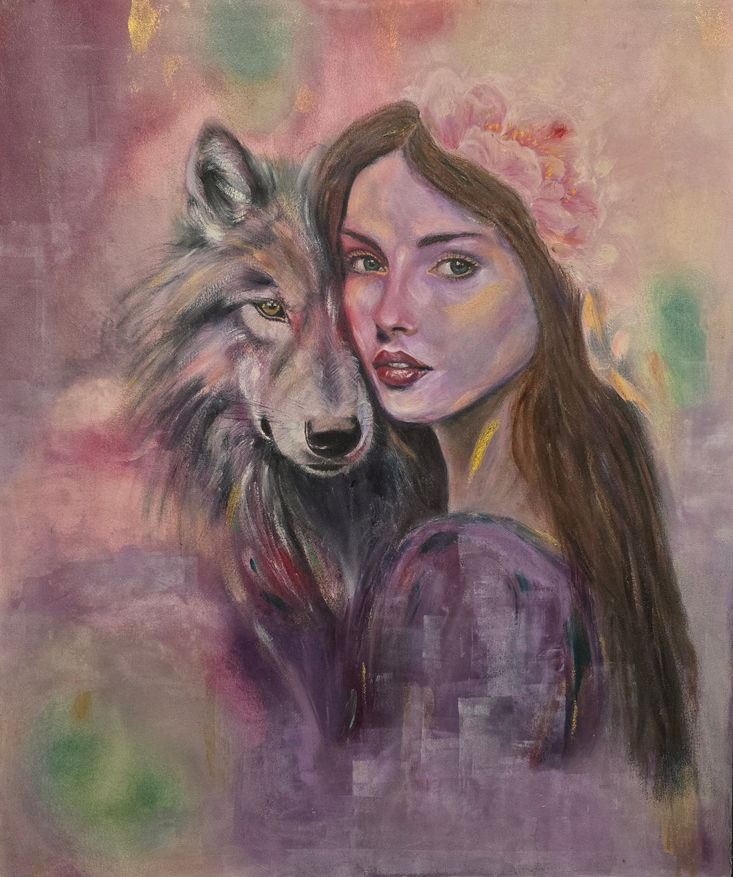​I wanted to capture the essence of a promise made not through words, but through shared silence and mutual respect. The wolf represents fierce, unwavering loyalty and the power of one's instinctual self. By juxtaposing the human figure with the intense gaze of the wolf and weaving them into a palette of vibrant purples, greens, and pinks, I aimed to create a visual conversation about the unbreakable bonds we forge—with others, and with the wilder parts of ourselves. The single flower acts as a subtle reminder of the vulnerability and preciousness contained within such a deep commitment.