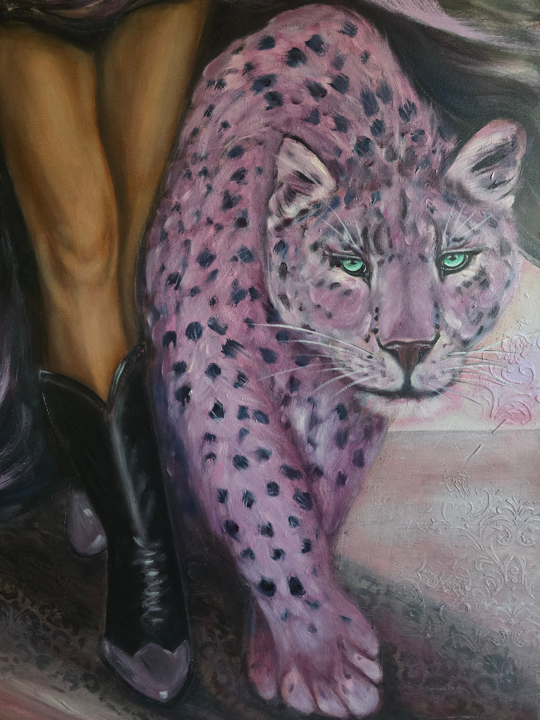 The Wild Card captures a moment of bold synchronicity between a woman and her pink counterpart. This large-scale oil painting is a statement of independence and untamed spirit, rendered in a striking pink palette that commands any room.